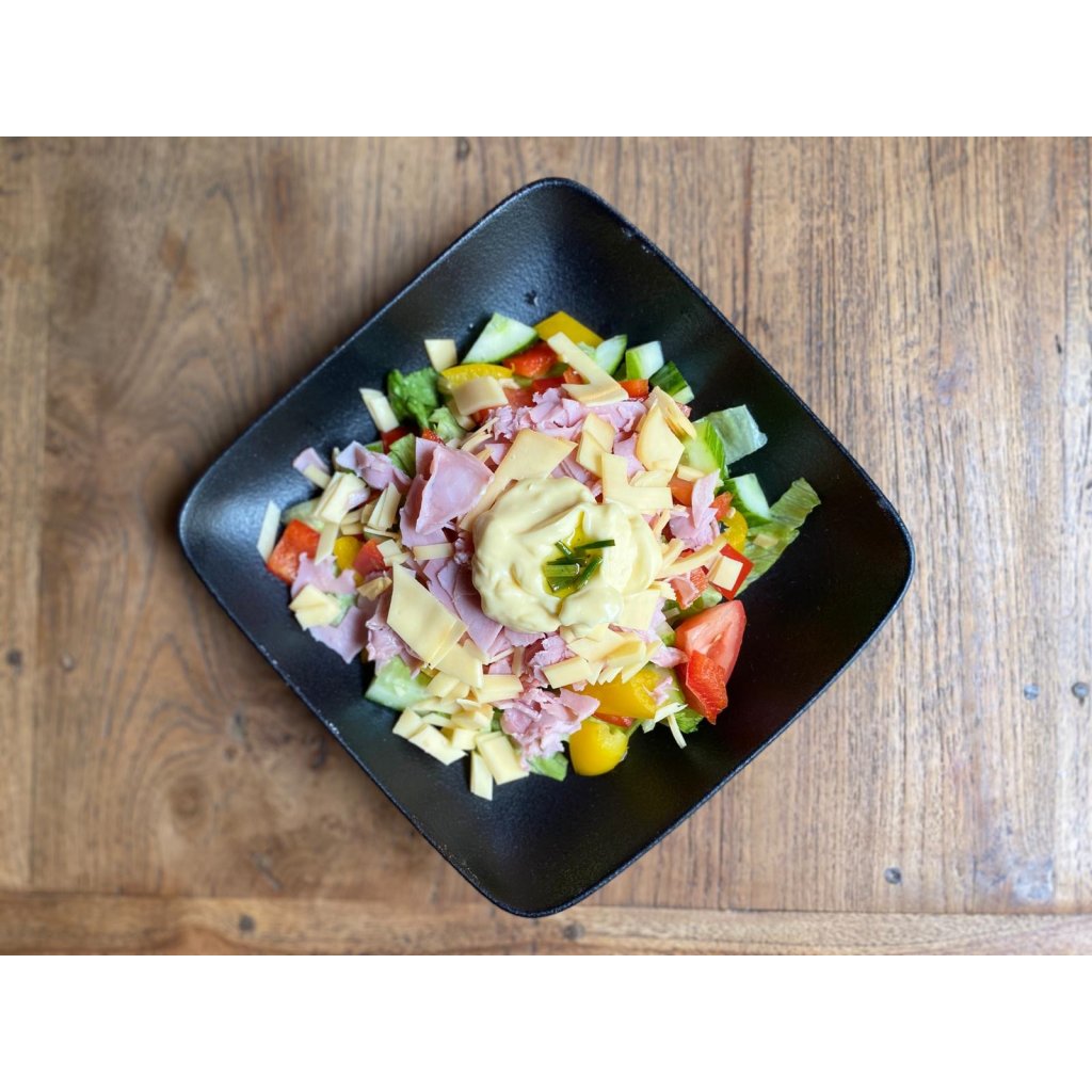 Ledový salát, rajčata, okurka, pečená paprika, šunka, sýr, majonéza. King ice lettuce, tomatoes, cucumber, grilled pepper, ham, cheese, maionesse