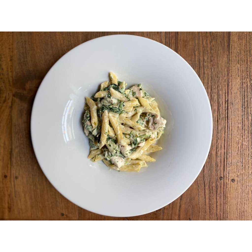 Smetanový špenát s kuřecími prsy. Creamy spinach with chicken breast.