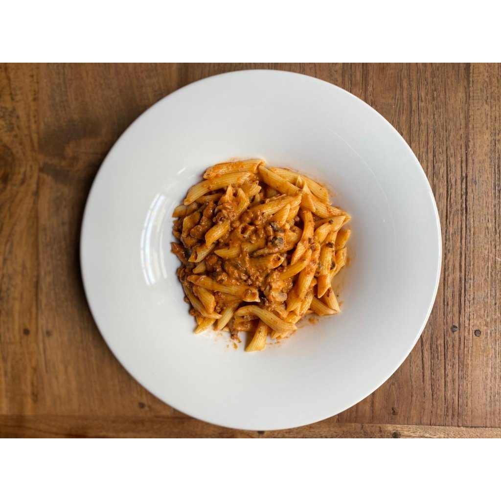Hovězí ragú s žampiony s smetanou, sypané feta sýrem. Beef ragu with mushrooms and cream topped with feta cheese.