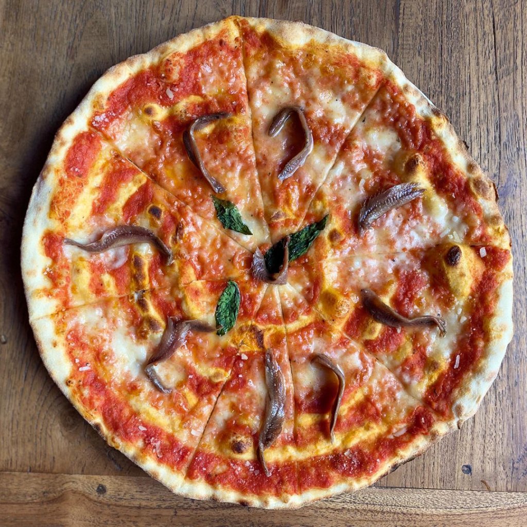 rajčata, mozzarella, ančovičky, bazalka. Tomato sauce, mozzarella, anchovies, basil.