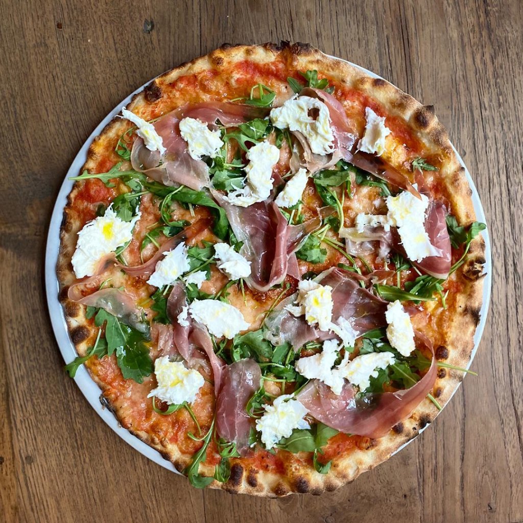 Rajčata, mozzarell, parmská šunka, rukola. Tomato sauce, mozzarella, parma ham. rucola.